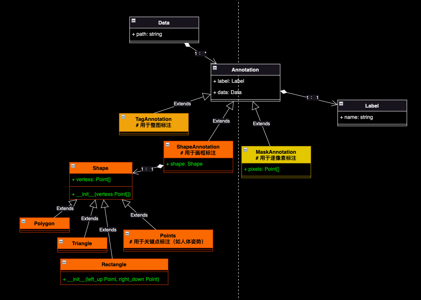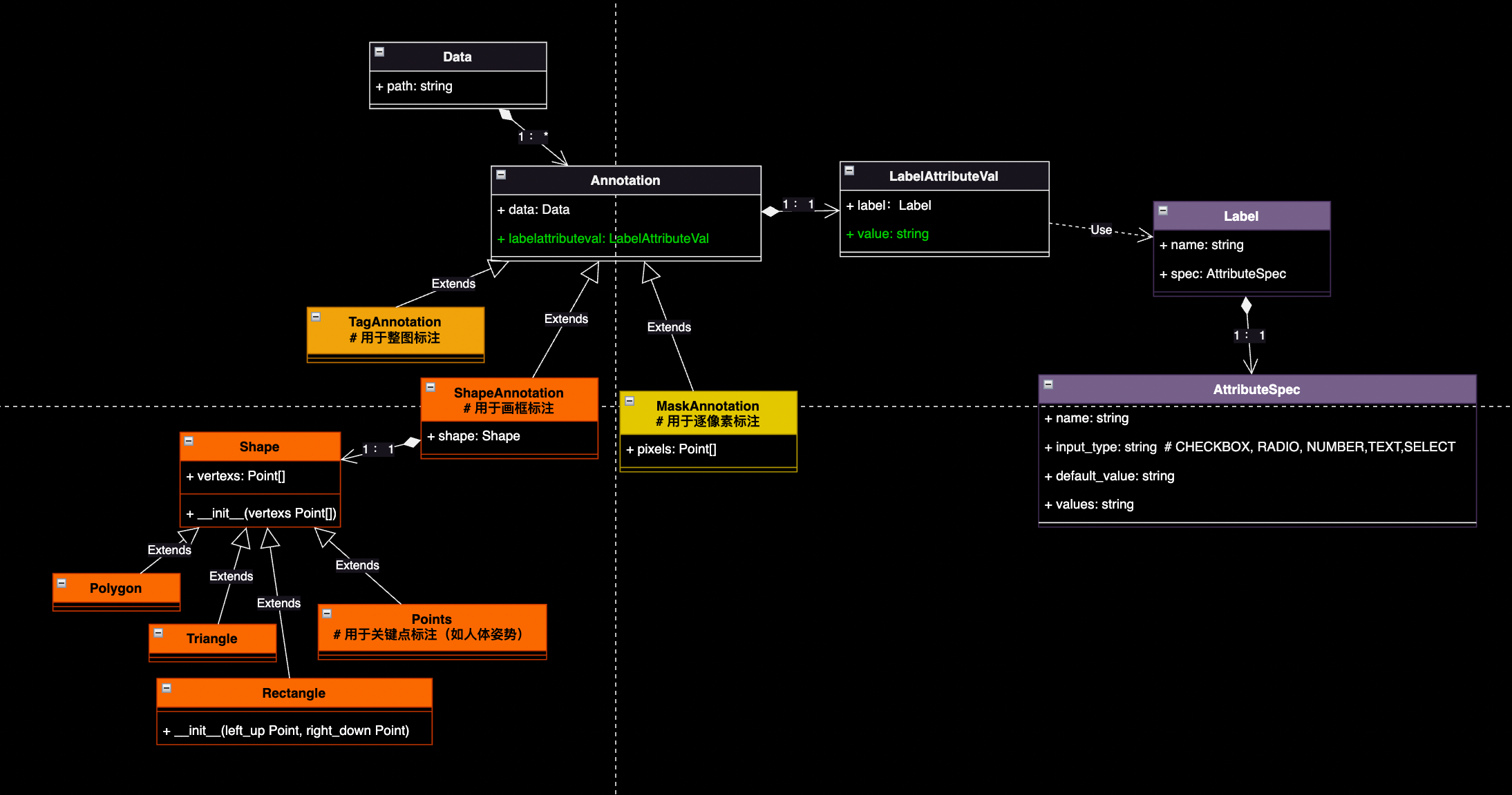 如上图,在这次模型调整中,我们从“Annotation”类派生出三个子类,分别对应“整图标注(TagAnnotation)”、“画框标注(ShapeAnnotation)”、“逐像素标注(MaskAnnotation)”三种情况。同时引入一个“Shape”的概念,辅助描述“ShapeAnnotation”类的属性。