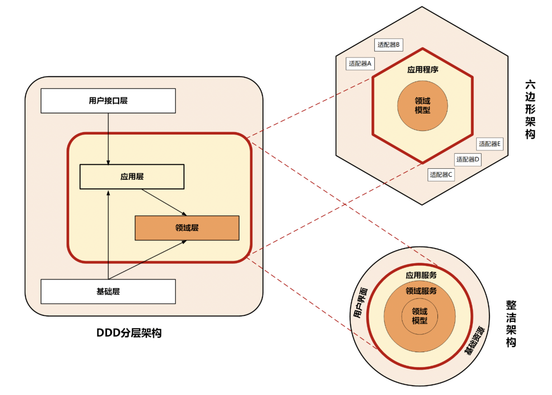 在这里,软件系统建模经验比较丰富的人,也许能闻到一点“领域驱动建模(DDD)”的味道。稍微扩展点,下图是传统的分层架构和六边形架构的对比图: