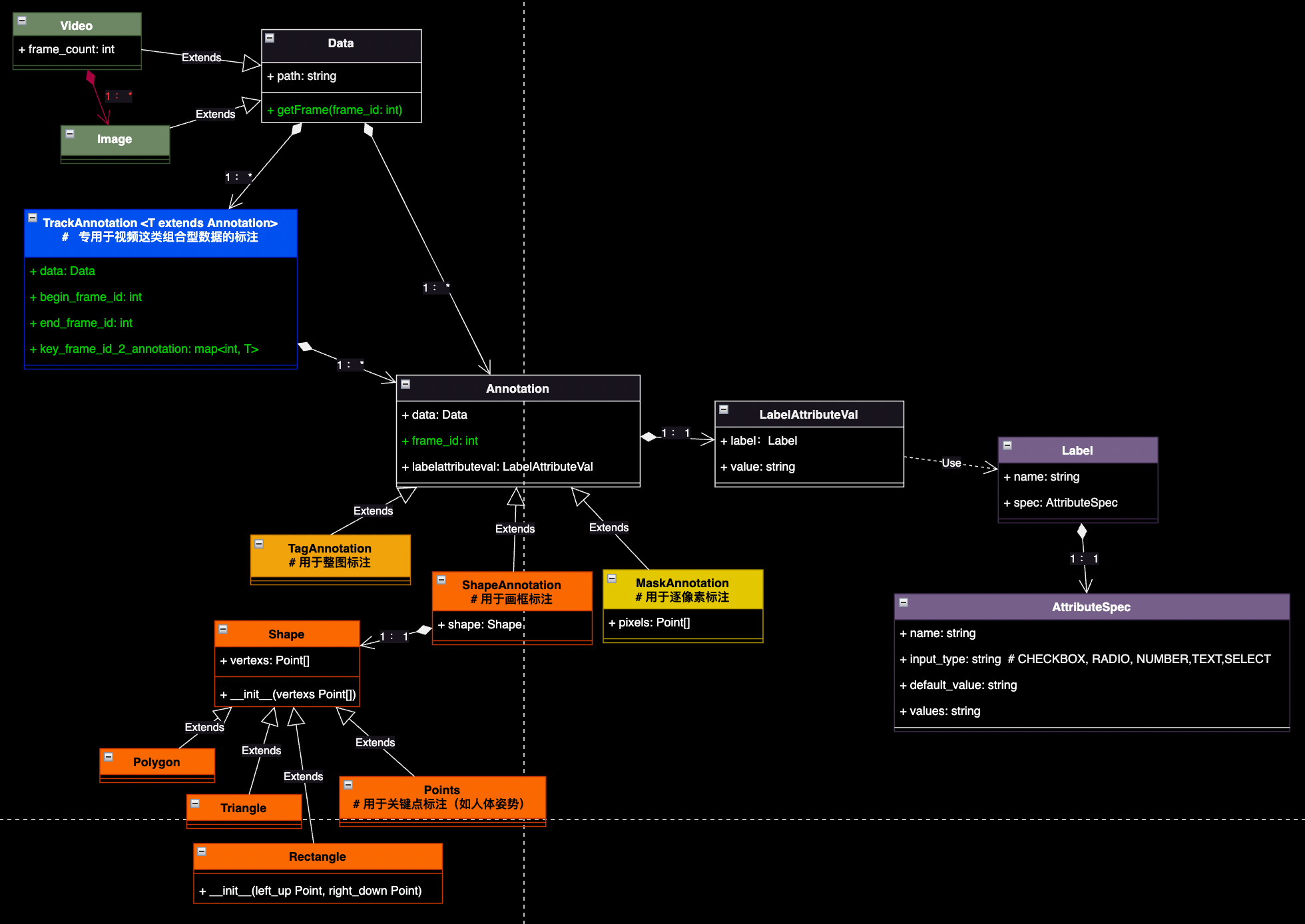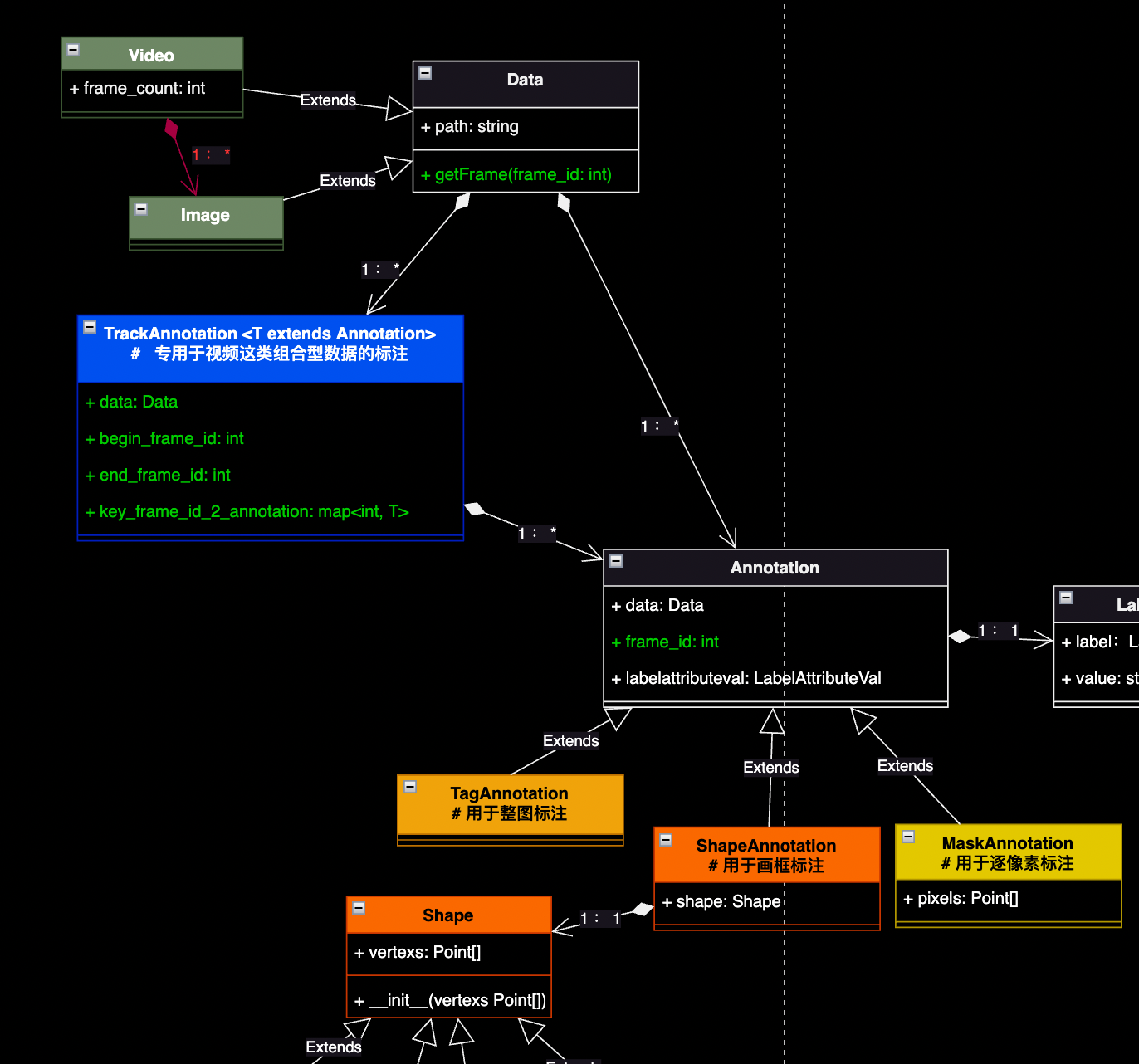 1)我们从“Data”类中派生出了“Image”和“Video”两个子类,且“Video”是“Data”的聚合类。这个聚合关系用红色特别标注出来,主要是为了强调,在这里只是描述这两个类间的关系,并不是说在具体实现的时候,会把视频类的文件拆成一张张图片再存入数据库。实际上这类系统对视频类文件的做法一般是直接存视频文件,在使用的时候再实时解帧成图片,即“Video”和“Image”类分别重写“Data”类的“getFrame()”接口,向标注员提供一张张图片供其标注即可(即“Image”和“Video”更像是承担了系统中的“DataProvider”的功能)。至于底层实现的时候是把视频实时抽帧,还是预先抽好放到存储里面,这得根据业务来决定。