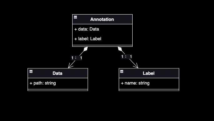 如果从语言学的角度来看,上述数据标注系统,要解决的核心问题就是,怎样描述一个数据是什么并保存起来. 上文中采用了”XXX(Data) 是 XXX(Label)"这样的一个简单的”主系表“基本句型来建模。这个句式基本能cover住一般的计算机视觉分类任务的。由此,可得本数据标注系统的第一版数据建模如下图: