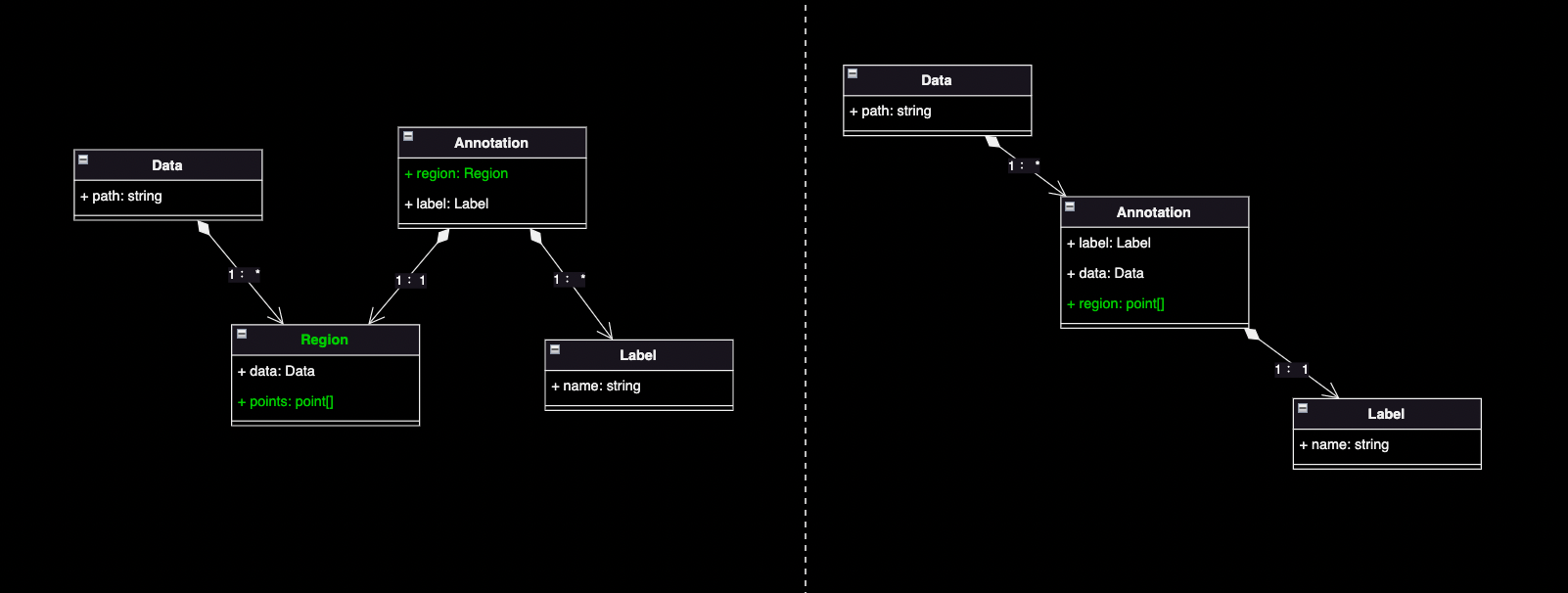 上述两个方案在功能上是等效的,差异点在于组织形式上,“Region”需要建模成一个独立的概念,还是建模成依附于“Annotation”的一个属性。这个比较难决策的点。尽管在一个“Region”可以对多个“Label”的情况下,左边的建模方案在数据存储是否冗余的角度会优于右边方案。但笔者还是觉得从整个系统的语义上看,“Region”的出现是对“Annotation”的一种补充说明,暂时还没有看到它能逃脱“Annotation”的独立语义职责(如“Data”在系统中担任了说明数据存放在哪的职责;“Label”在系统中承担了对“Annotaion”的规范约束的职责),所以在这里笔者比较倾向于选择右边的方案,“Region”是“Annotaion”的一个属性。