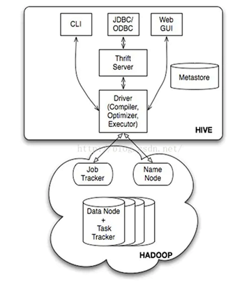 - Driver:驱动引擎,管理HQL执行生命周期(启动会话、执行、监督等),并将执行过程中产生的必要元数据发送给MetaStore,将执行结果返回给上层客户端。