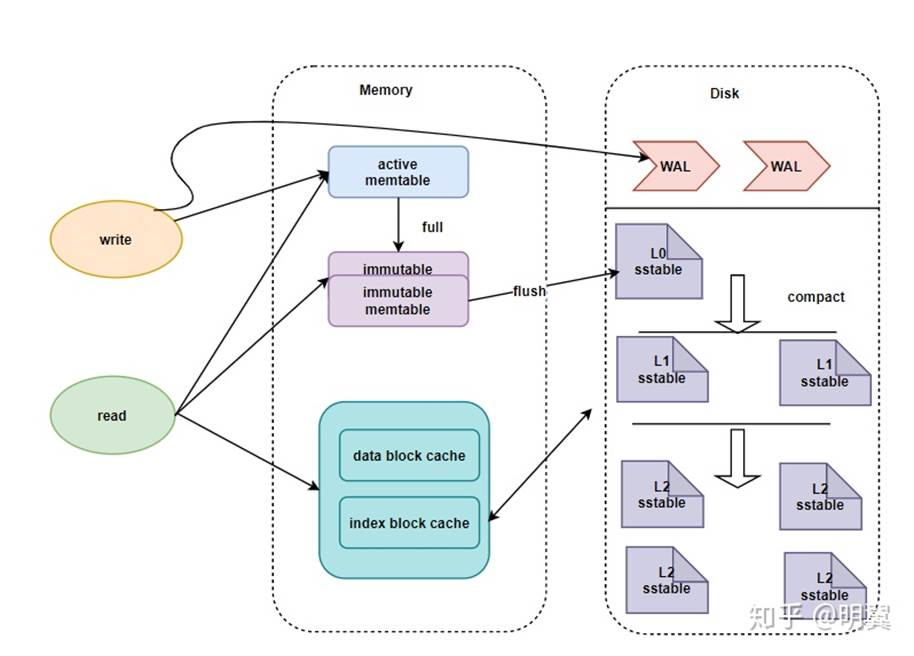 - 数据先写入内存的memtable(采用红黑树或跳表等保证数据有序)。memtable满了转化成只读的immutable。适当时机immutable刷盘到磁盘上保存为sstable(有序键值对集合)。