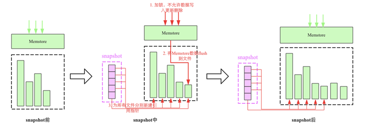 HBase的快照(Snapshot)不同于传统意义上的某一个时刻完整数据拷贝,它仅仅是在某一个时刻所有数据的完整指针。流程如下: