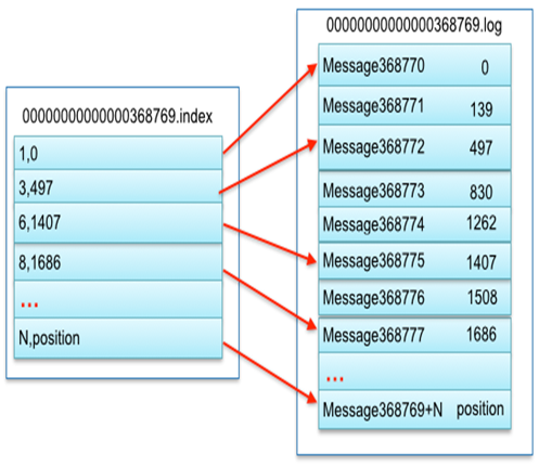 - 索引文件稀疏存储。例如:针对100条消息,只存储1、20、40、60、80条消息的位置,如果要查找第23条数据,则直接在index中找到20的位置,再偏移3条即可。