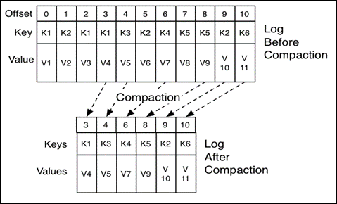 - Kafka提供“delete”和“compact”两种删除消息的方式。compact指压缩消息,仅保留每个Key对应的最新Value,如下: