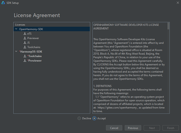 在弹出的SDK下载页面,单击“Next”,并在弹出的License Agreement窗口,阅读License协议,需同意License协议后(需同时接受OpenHarmony SDK和HarmonyOS SDK的License协议),单击“Next”开始下载SDK。
