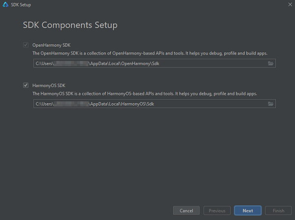 在SDK Components Setup界面,可以自行设置OpenHarmony SDK和HarmonyOS SDK存储路径,注意两者不能存放于同一个文件夹中。单击“Next”进入下一步。