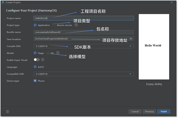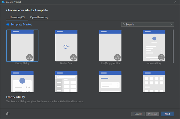 DevEco Studio为我们提供了HarmonyOS和OpenHarmony的创建模板,我们这里选择创建HarmonyOS,然后选择Empty Ability,单击“Next”,进入工程配置页。
