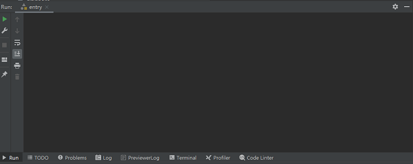 在编辑器底部有一行工具栏,主要介绍常用信息栏,其中Run是项目运行时的信息栏,Problems是当前工程错误与提醒信息栏,Terminal是命令行终端,在这里执行命令行操作,PreviewerLog是预览器日志输出栏,Log是模拟器和真机运行时的日志输出栏。在后续使用中会陆续接触。