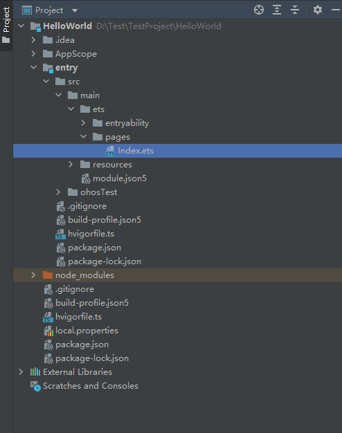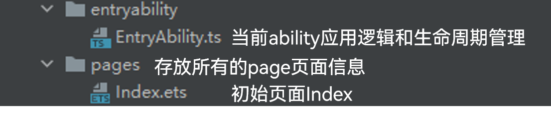 进入src>main>ets目录中,其分为entryability、pages两个文件夹。entryability存放ability文件,用于当前ability应用逻辑和生命周期管理;pages存放UI界面相关代码文件,初始会生产一个Index页面。