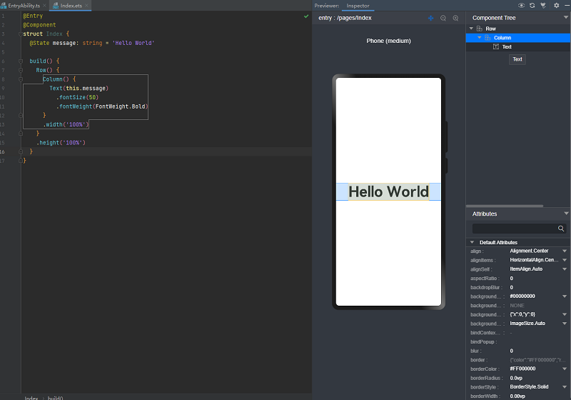 进入DevEco Studio页面后,首先了解整体的界面和功能,中间的是代码编辑区,你可以在这里修改你的代码,以及切换显示的文件。通过按住Ctrl加鼠标滚轮,可以实现界面的放大与缩小。