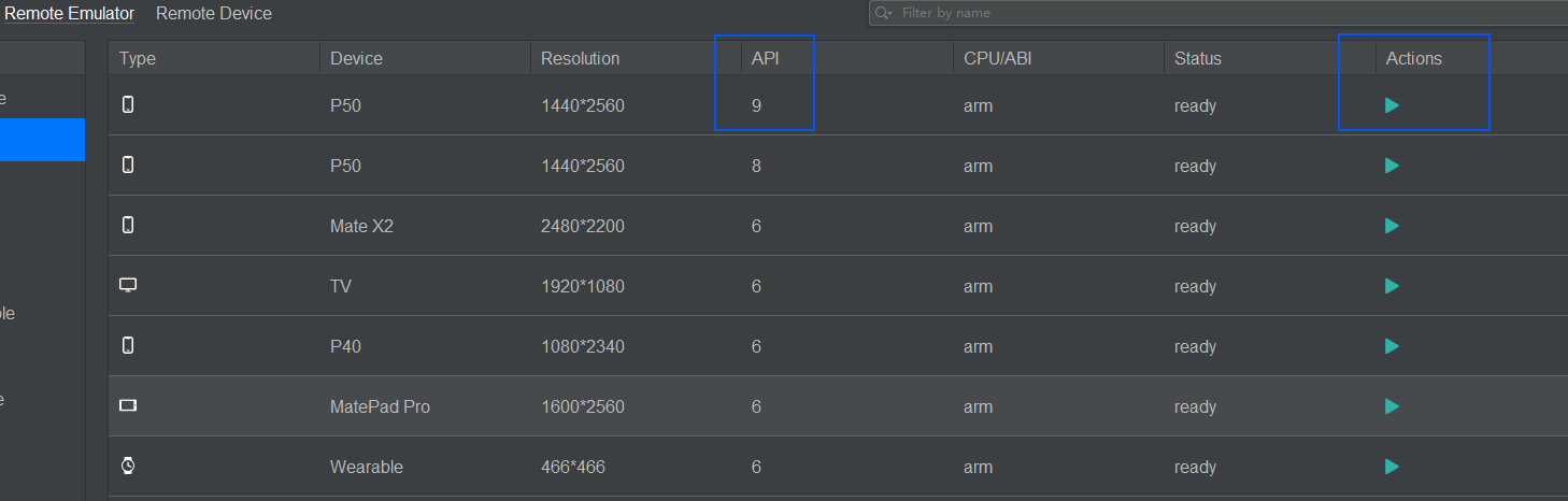3. 选择远程模拟器设备,如选择P50,对应创建的API9工程,单击“Actions“接入远程模拟器。