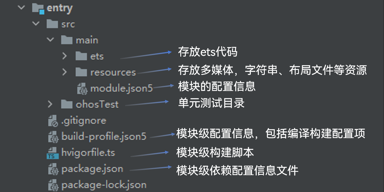 entry>src目录中主要包含总的main文件夹,单元测试目录ohosTest,以及模块级的配置文件。