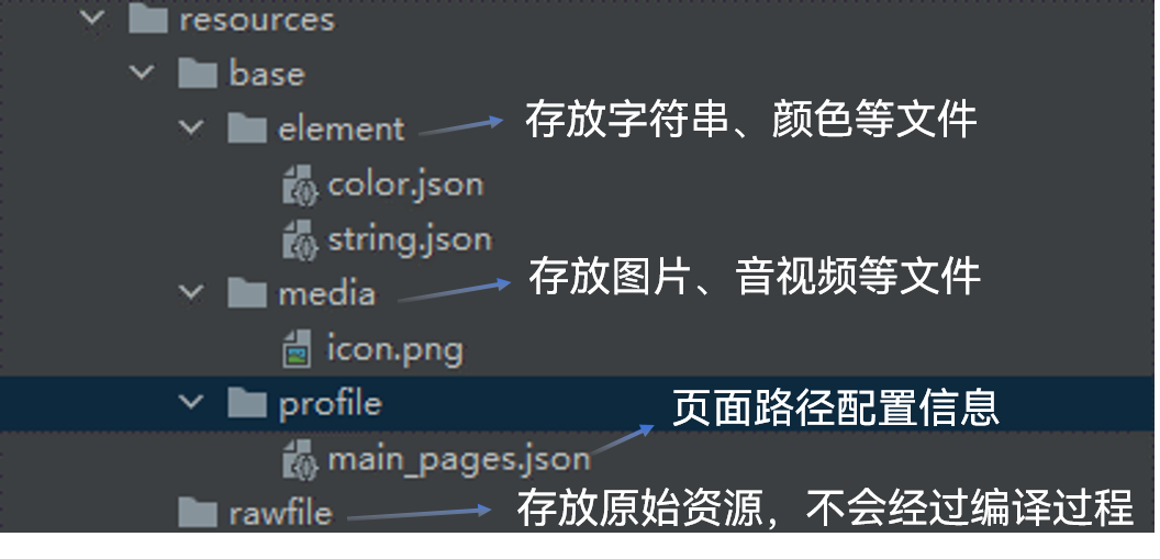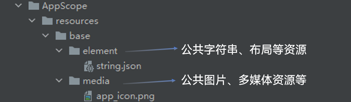 AppScope>resources>base中包含element和media两个文件夹,其中element文件夹主要存放公共的字符串、布局文件等资源;media存放全局公共的多媒体资源文件。