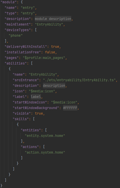 其中module对应的是模块的配置信息,一个模块对应一个打包后的hap包,hap包全称是HarmonyOS Ability Package,其中包含了ability、第三方库、资源和配置文件。其具体属性及其描述可以参照下表1。