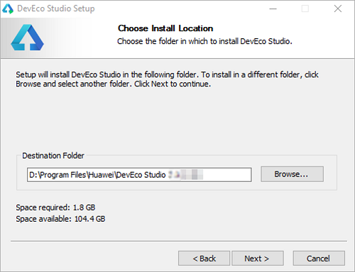 下载完成后,双击下载的“deveco-studio-xxxx.exe”,进入DevEco Studio安装向导,在如下界面选择安装路径,默认安装于“C:\Program Files”下,也可以单击“Browse...”指定其他安装路径,然后单击“Next”。