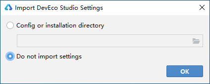 双击已安装的DevEco Studio快捷方式进入配置页面,首次使用,请选择“Do not import settings”,单击“OK”。