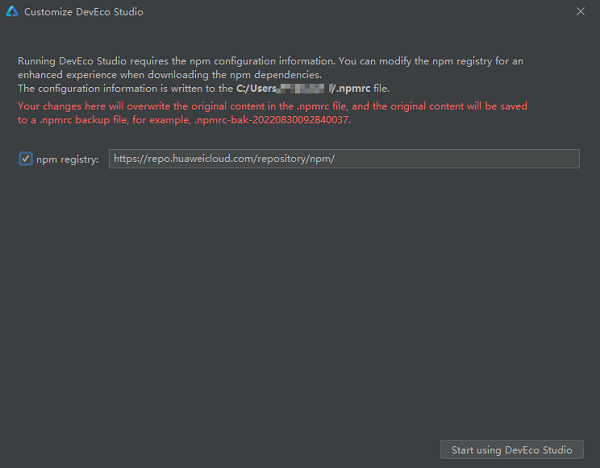 进入DevEco Studio操作向导页面,设置npm registry,DevEco Studio已预置对应的仓库,直接单击“Start using DevEco Studio”进入下一步。
