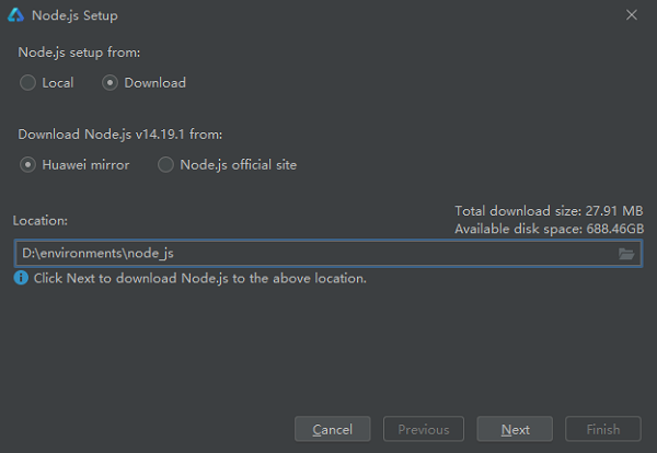 进入Node.js的配置页,选择Dowload,从Huawei mirror下载对应的版本,“Location”建议自行设置指定位置。