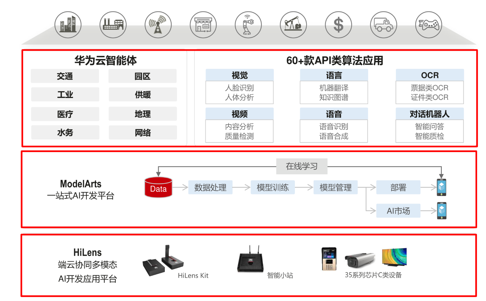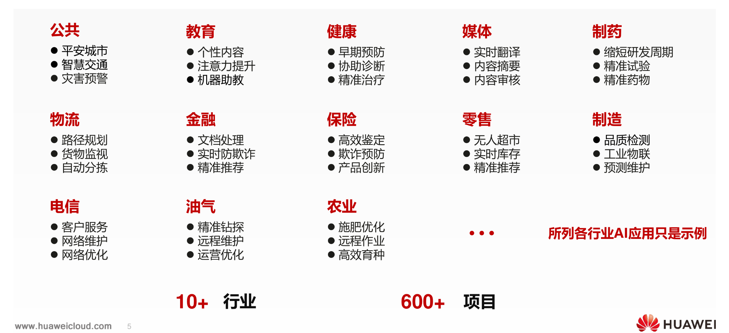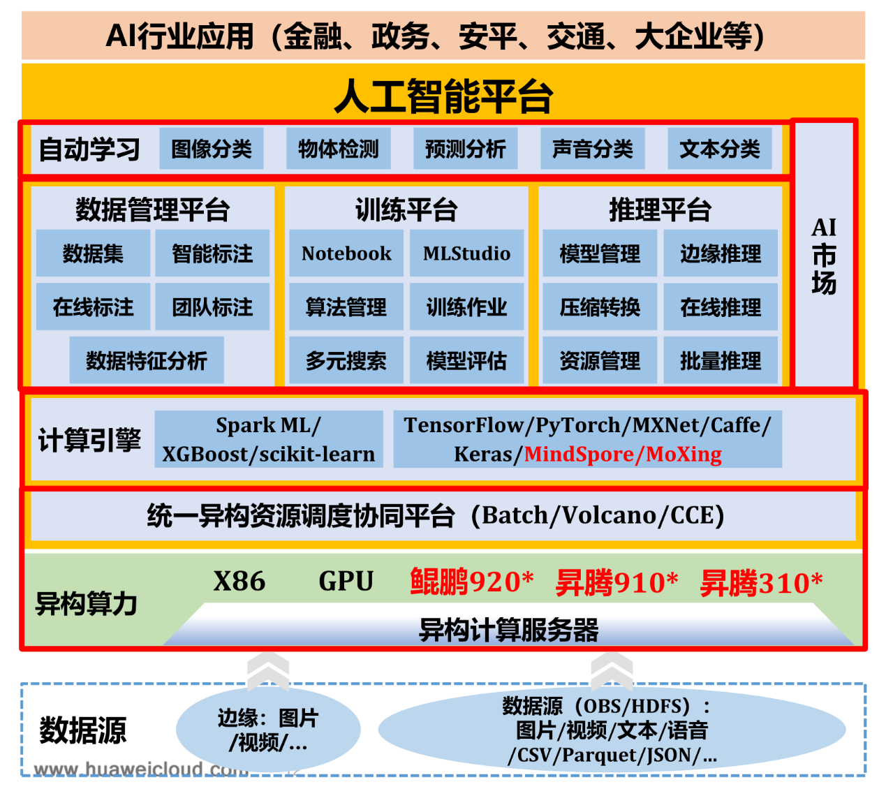 针对Al应用当中的各种痛点,华为公司提供全栈全场景AI解决方案,为客户提供了从底层AI芯片、Al框架到应用使能的能力;面向政府、企业与开发者,提供全栈Al解决方案华为云El。