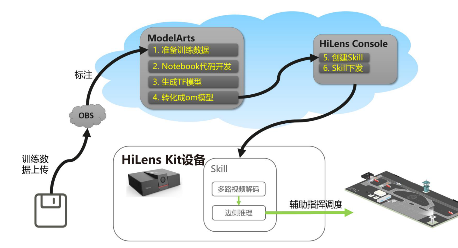 某伙伴基于华为云一站式Al开发平台ModelArts 开发训练机场地面物体检测模型,通过华为端云协同多模态Al开发应用平台HiLens 将模型部署到 HiLens Kit上实现端侧推理,最大限度保证推理的时效性,给空管调度人员提供及时准确的地面信息,辅助空管人员做出调度指令,确保每个航班的安全起降。