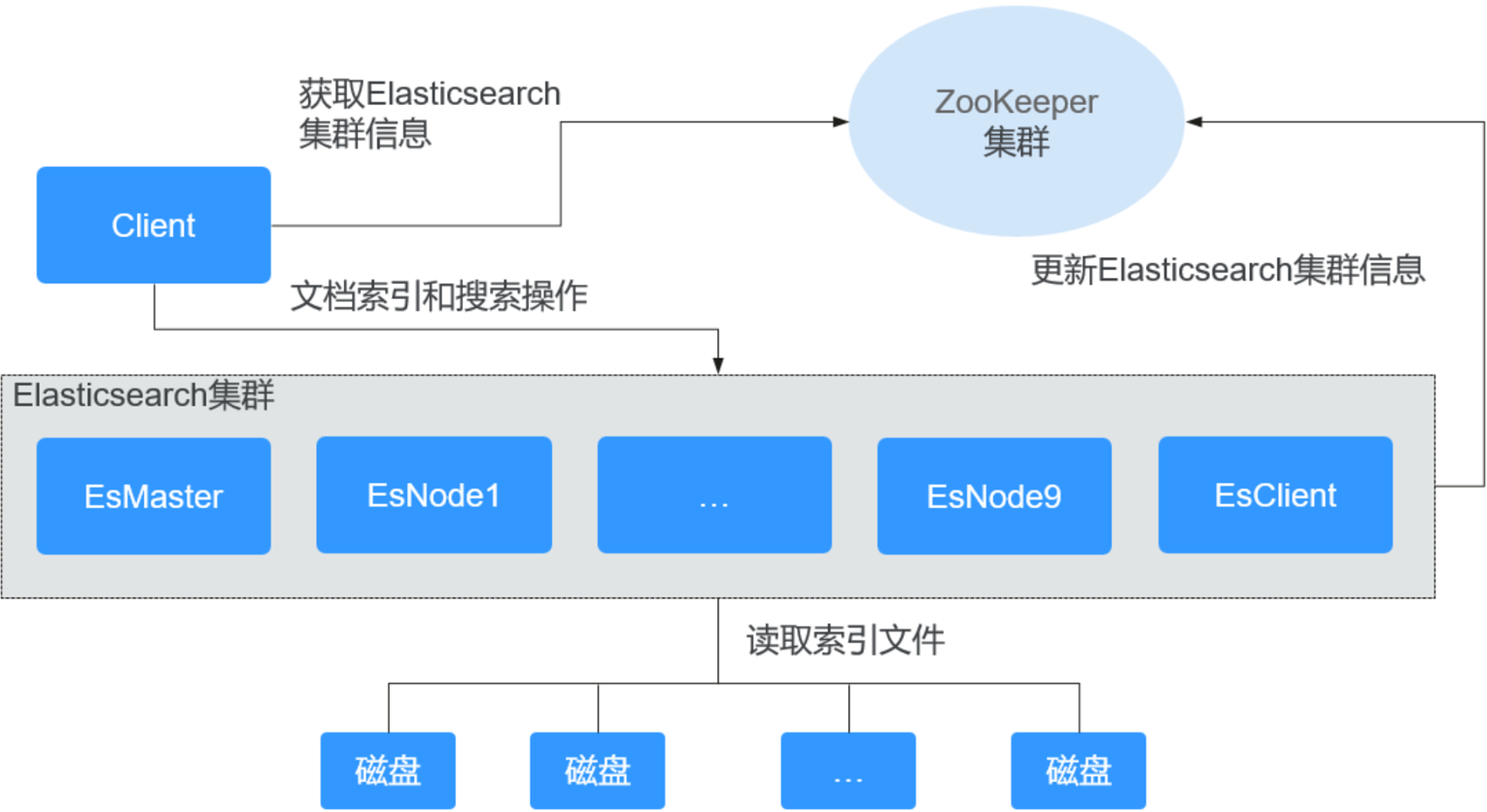 - EsNode:数据节点,主要是存储索引数据,对文档进行增删改查、聚合等操作。节点上每个EsNode进程对应一个目录,存放该EsNode管理的索引分片。