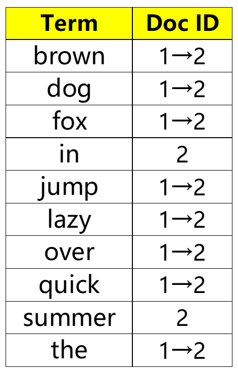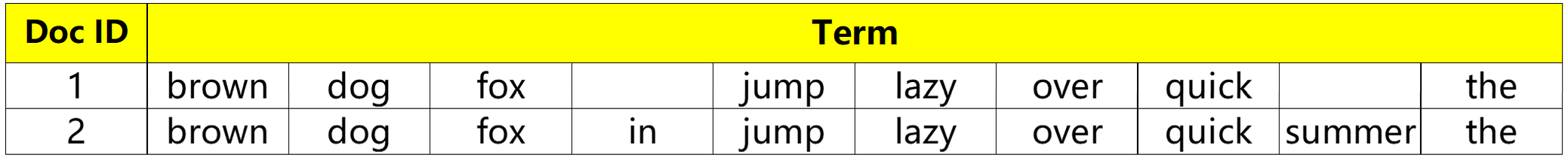 即从所有文档中抽取Term,构建Term与文档ID的映射关系。例如: