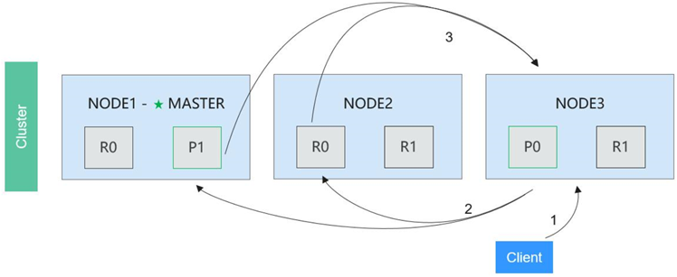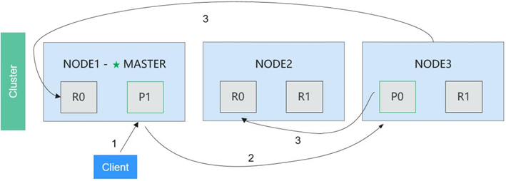 - 客户端将索引请求发送任意节点Node1上主分片P1