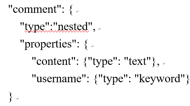 nested: 一种特殊的object字段,需要显式指明字段类型为“nested”,能将{…}里面多个[]当成一个整体来搜索,而不是像object那样将内部嵌套的{…}扁平化。例如: