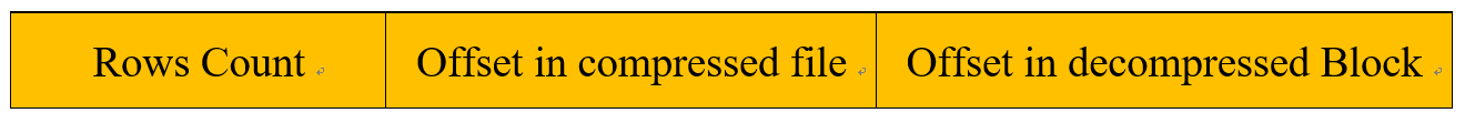 - <col name>.mrk/<col name>.mrk2:列字段标记文件,记录Granule行数,相应Block在列存压缩文件中的偏移量,Granule在解压后的Block中的偏移量。如果使用了自适应大小的索引间隔,会以.mrk2命名。