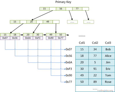- 索引:数据库系统中维护满足特定查找算法的额外文件,通常文件存储指向数据位置的指针。传统关系型数据库多采用B树建立索引文件。索引文件需要占用磁盘空间,且插入数据后索引需要重构(B树平衡过程),因此写性能会降低。B树索引示例如下: