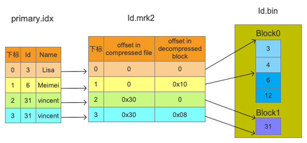 - 根据主键查找idx找到下标(mark),再根据下标与id.mrk2联结找到数据存储的Block及Block内Granule的位置