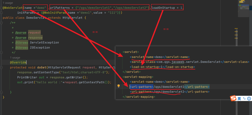 @WebServlet(name ="demo" ,urlPatterns = {"/qgs/demoServlet1","/qgs/demoServlet2"}, loadOnStartup = 1,