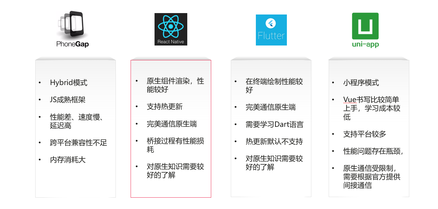 从框架诉求、开发能力模型、维护成本3个维度出发,华为云数字化差旅开发团队综合评估了市面上主流成熟的混合开发框架,通过分析Hybrid、React Native、Flutter、Uni-app等框架的优缺点,结合实际业务诉求,先引入React Native框架去尝试解决业务交付难题。