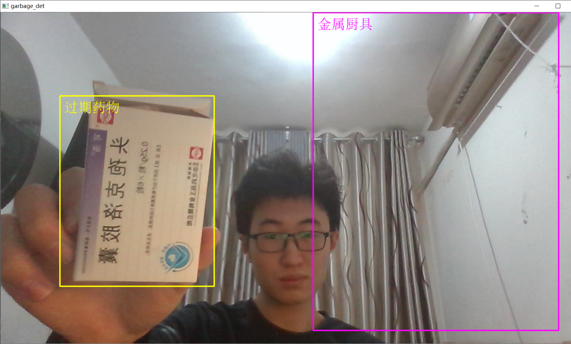 即使用编号为0的摄像头(默认为PC自带的摄像头),输出画面显示到名为garbage_det的本地屏幕窗口中。