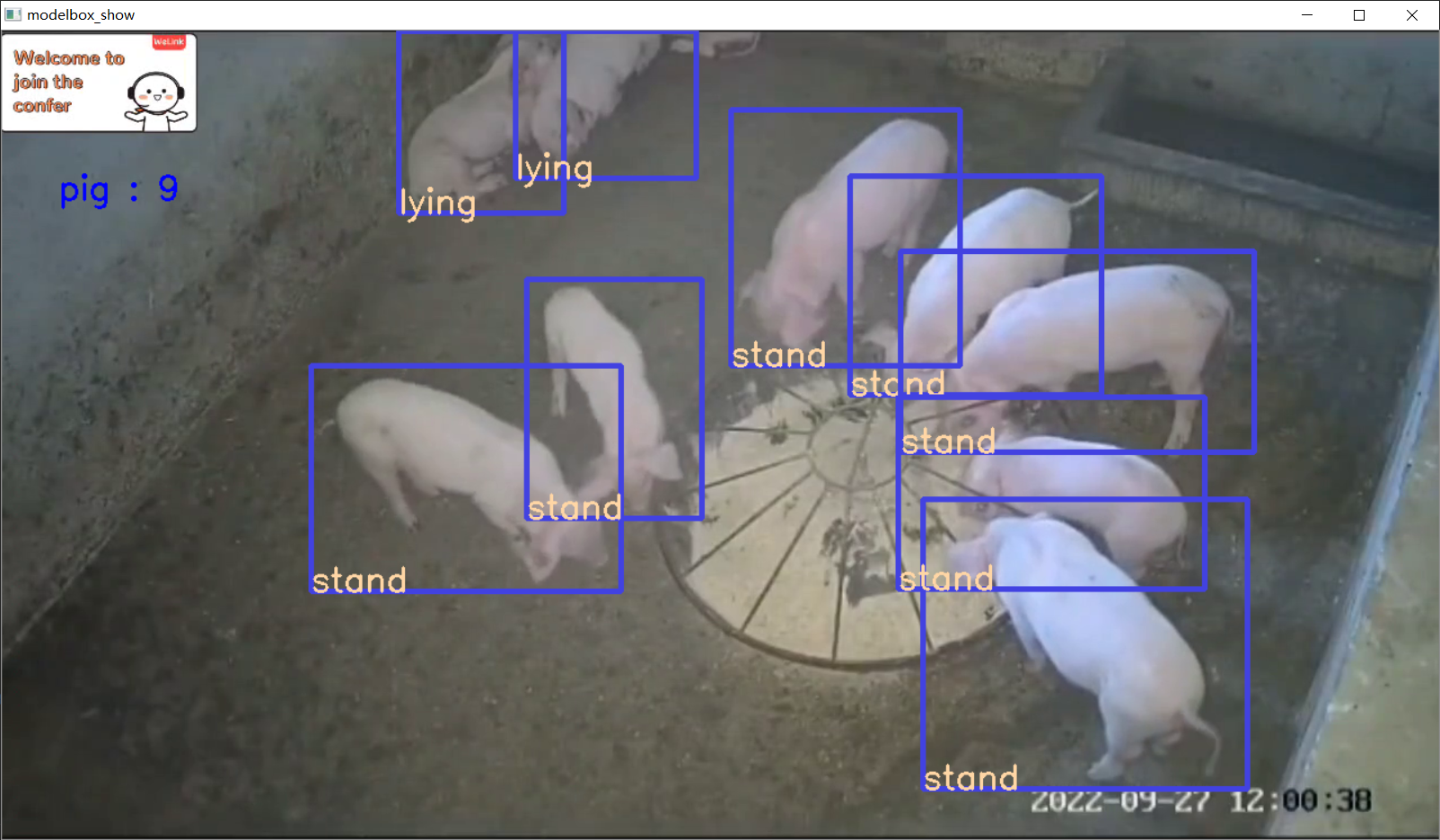 即使用本地视频文件data/pig.mp4作为输入,解码、预处理、猪只检测、后处理、猪只体态识别后,输出画面显示到名为modelbox_show的本地屏幕窗口中。