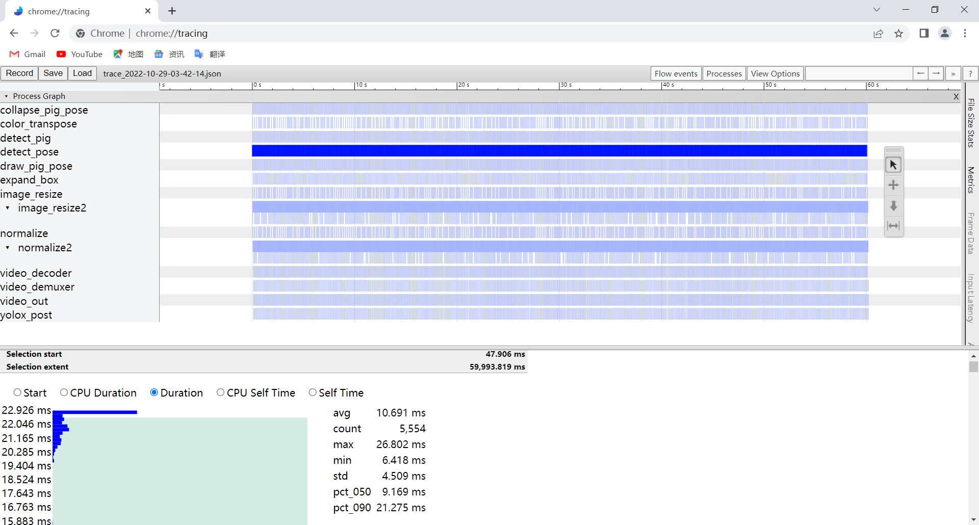 我们可以在Chrome浏览器chrome://tracing/中加载性能统计文件查看: