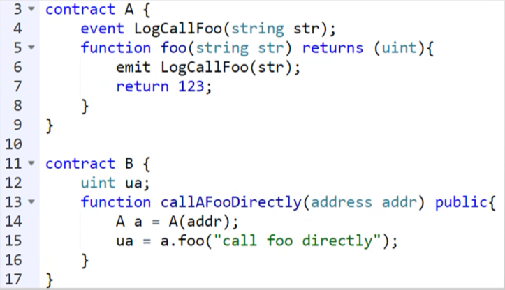 一个交易只有外部账户才可以发起,一个合约账户不能主动发起一个交易进行合约调用。因此上面的调用是需要一个外部账户调用合约B的callFooDirectly函数,然后callFooDirectly函数内部调用合约A的foo函数。