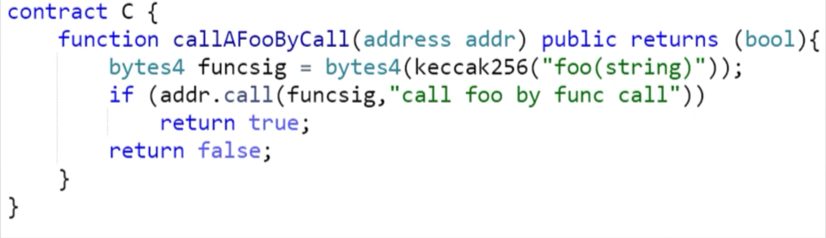 A(addr).foo("call foo by func call") - 返回一个布尔值表明了被调用的函数已经执行完毕(true)或者引发了一个EVM异常(false),无法获取函数返回值。即调用失败也不会引起当前C合约的回滚。