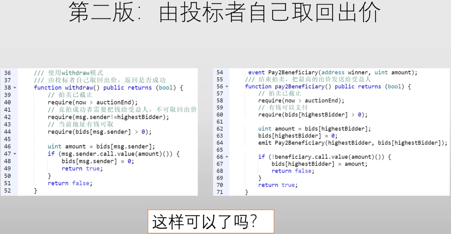红框处语句调用可能会失败异常,导致所有人都收不到钱,钱被锁死在合约账户中
