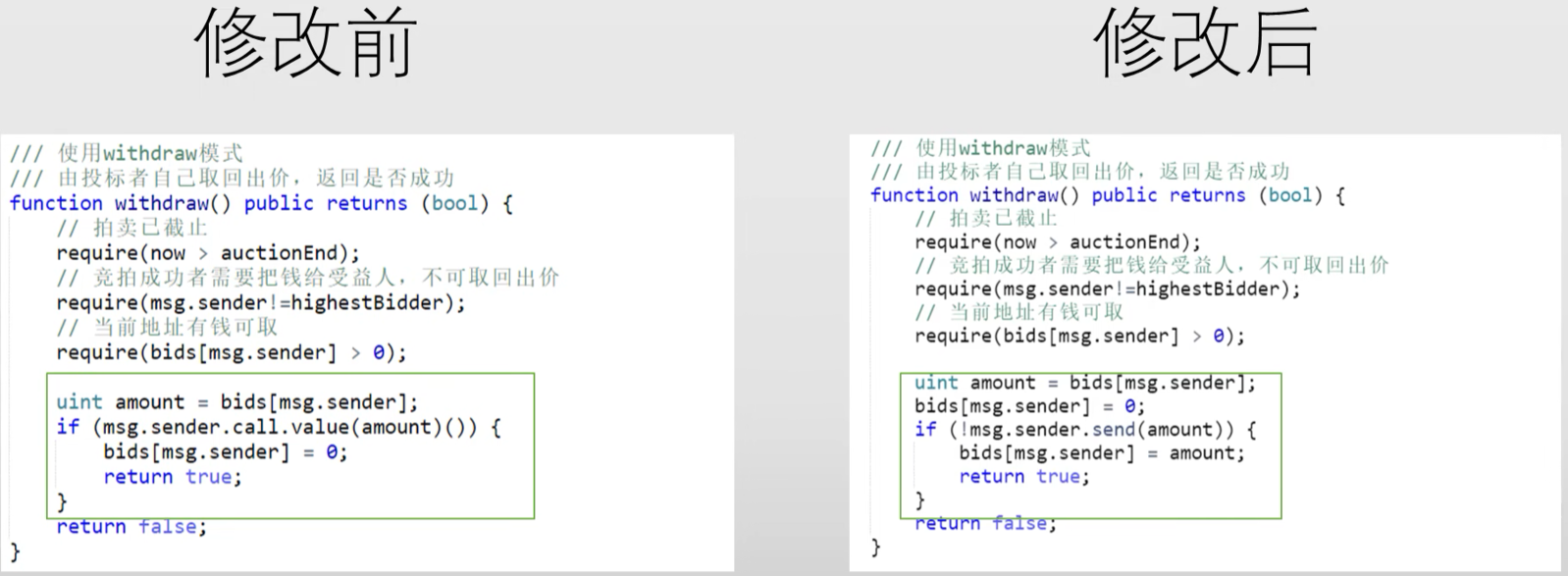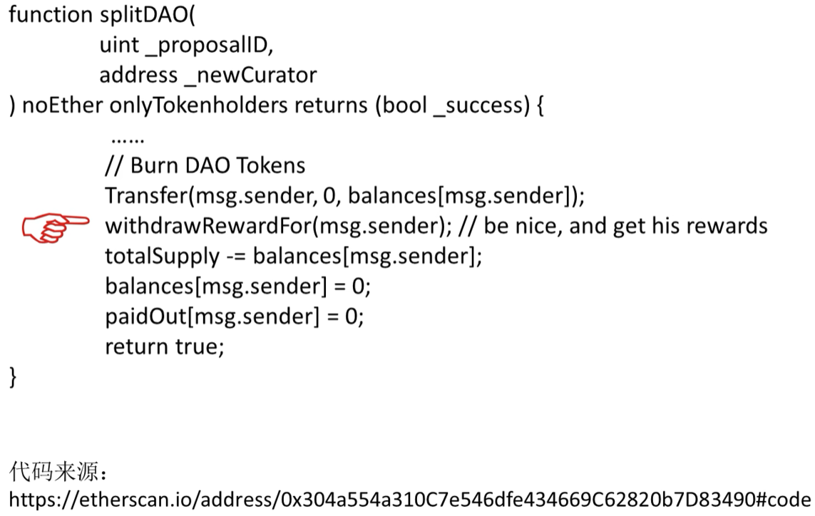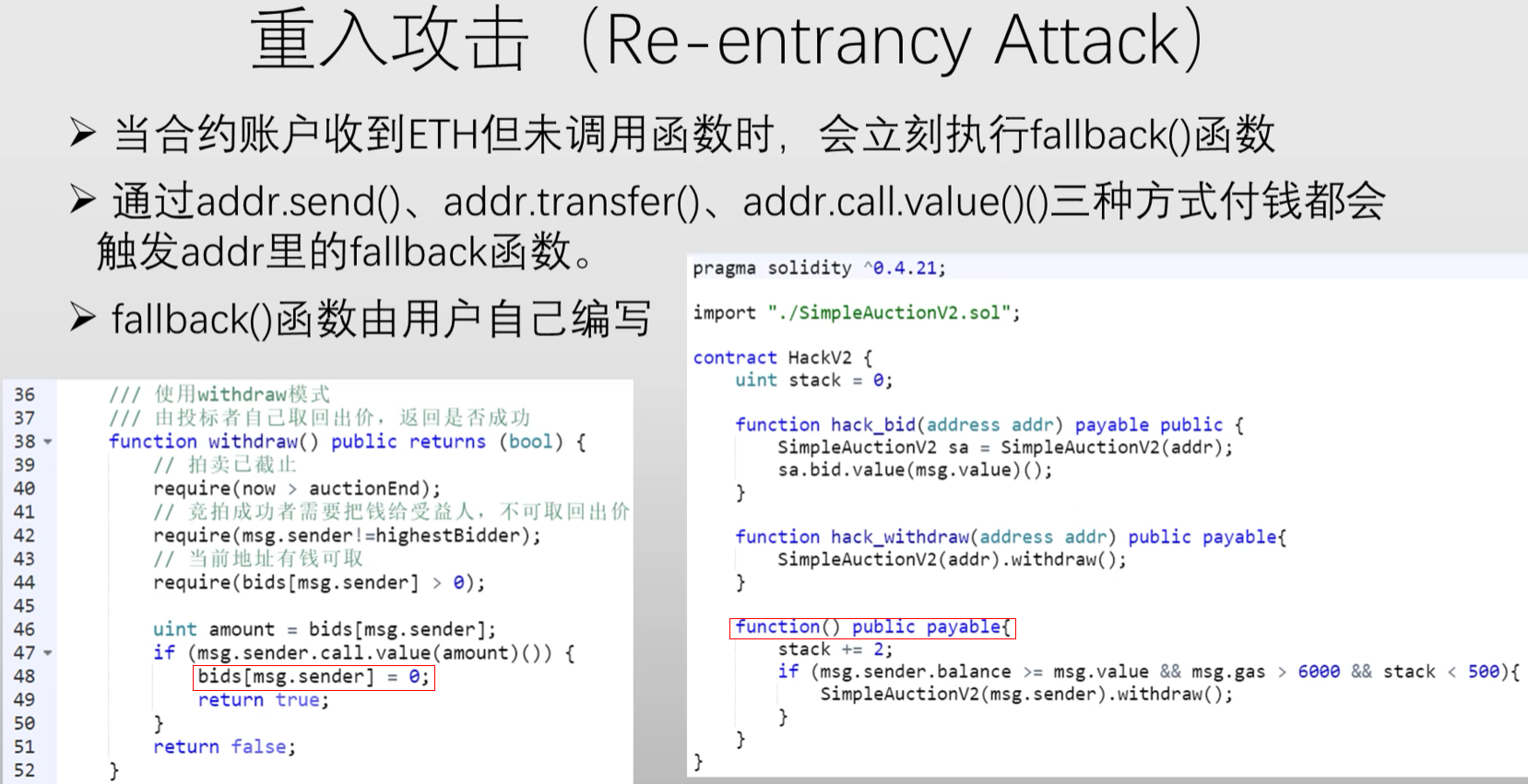 **黑客合约可以在清零之前递归调用取钱的合约,达到重入攻击。**因此一般写合约需要先判断条件,再修改条件,最后才进行与其他合约的交互。