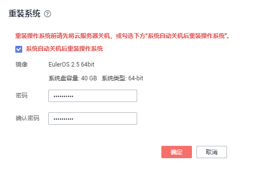 - 只有关机状态的云耀云服务器才能重装系统。重装操作系统前请先将云服务器关机,或根据页面提示勾选“系统自动关机后重装操作系统”。
