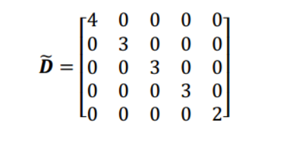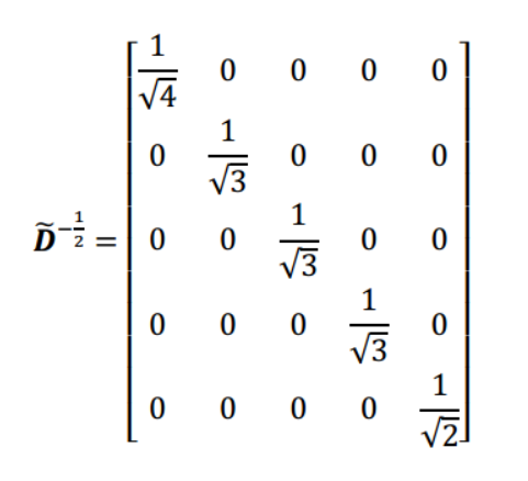 是在自连度矩阵的基础上开平方根取逆。求矩阵的平方根和逆的过程其实很复杂,好在只是一个对角矩阵,所以此处直接可以通过给每个元素开平方根取倒数的方式得到。在无向无权图中,度矩阵描述的是节点度的数量; 若是有向图,则是出度的数量; 若是有权图,则是目标节点与每个邻居连接边的权重和,而对于自连度矩阵,是在度矩阵的基础上加一个单位矩阵,即每个节点度的数量加1。