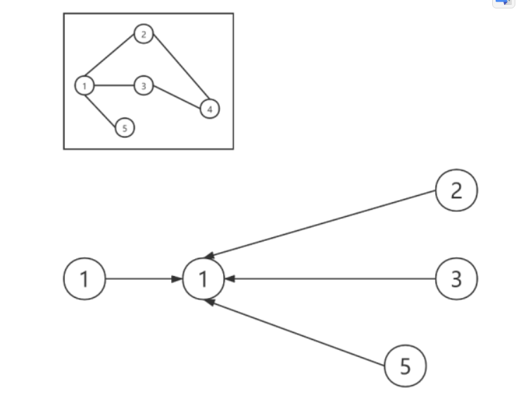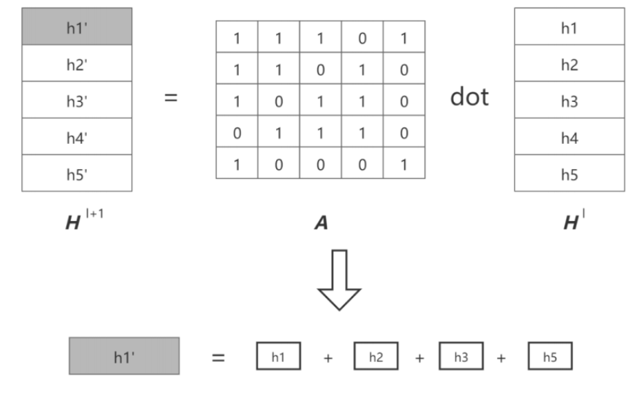 相信大家了解矩阵间点乘的运算规则,即线性变化的计算过程。在自连邻接矩阵满足图2的数据场景时,下一层第1个节点的向量表示是当前层节点h1、h2、h3、h5 这些节点向量表示的和。这一过程的可视化意义如图3所示。