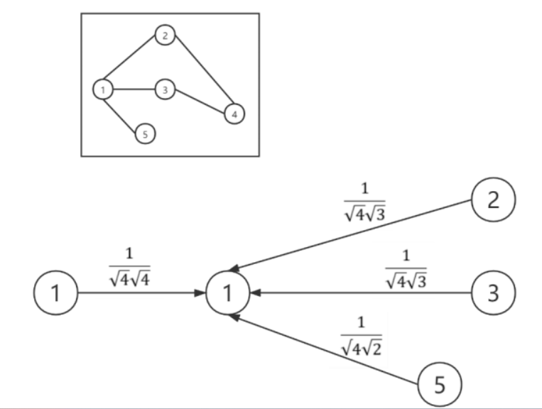 没错,这是一个加权求和操作,度越大权重就越低。图4中每条边权重分母左边的数字4是节点1自身度的逆平方根。