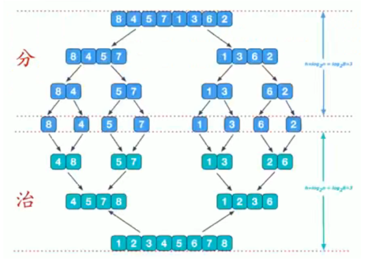 归并排序(MERGE-SORT)是利用归并的思想实现的排序方法,该算法采用经典的分治(divide-and-conquer)策略(分治法将问题分(divide)成一些小的问题然后递归求解,而治(conquer)的阶段则将分的阶段得到的各答案"修补"在一起,即分而治之)。