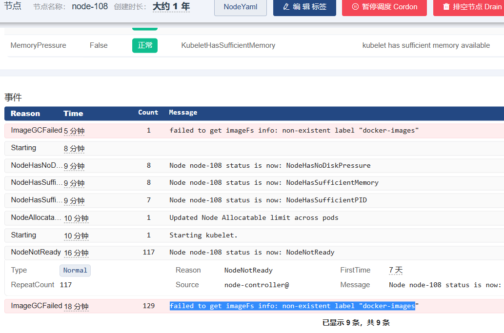 从报错Image garbage collection failed: non-existent label "docker-images"看出来是没有存在的docker images标签之类的。