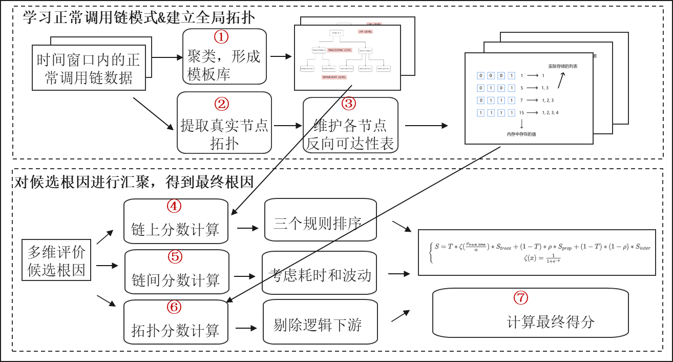 针对目前性能恶化定位成本高的问题,我们提出了一种先在异常调用链内部分析候选根因,再在全局拓扑环境下对候选根因进行汇聚的二级分析方法,并提出了一种计算三项得分的多维评价方法,综合考虑真实环境中的多种因素,以更准确更高效地推荐根因。