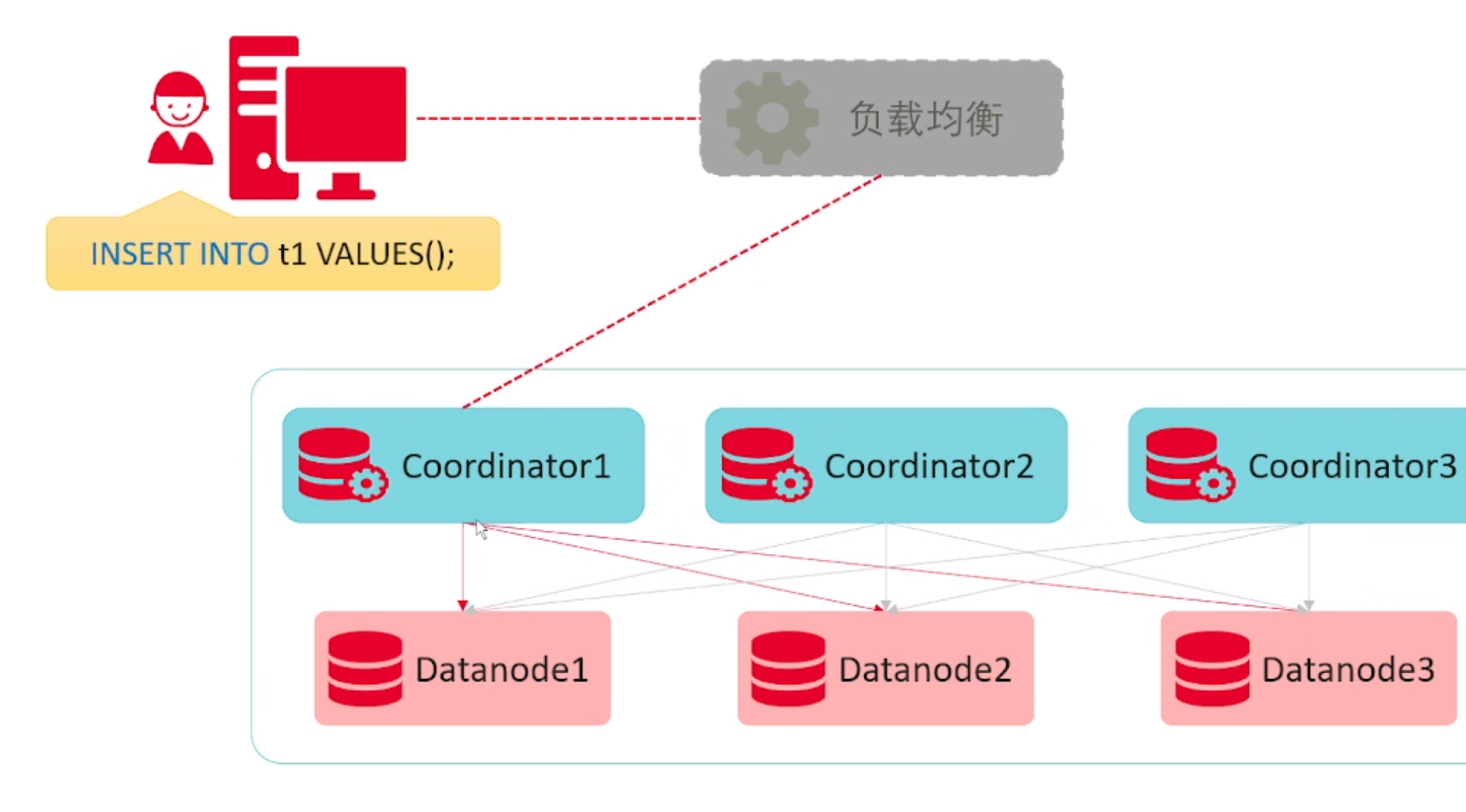 可以在下图中分析出,SQL的DML语句可以在任意的CN中获取相同的结果。DDL语句必须在所有的CN上执行成功。